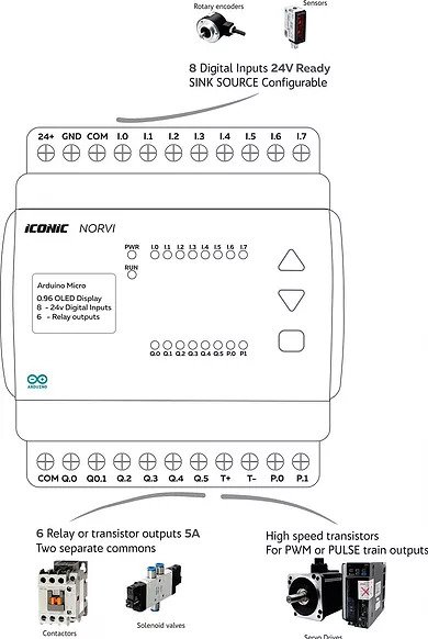 NORVI Cema Industrial Arduino is the most compact version of NORVI series. Yet it has 8 Outputs and 8 Inputs, beating all the devices of same size on the market. Two transistor outputs of it adds PWM or Pulse output capabilities. It comes with a 6 pin expansion port with Serial output. Cema is leading with reliability in the industrial environments.